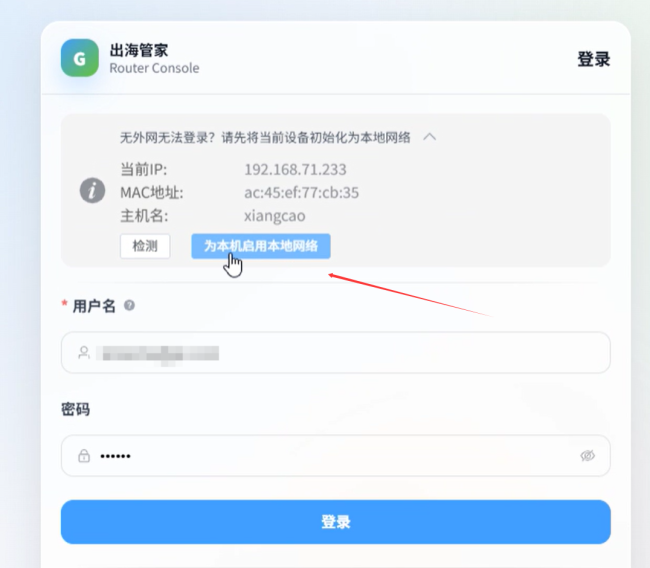 首次连接光年出海盒子WIFI/有线连接后 ,在浏览器中输入:192.168.71.1  ,然后首次连接默认是无网络状态,需要点击上边的提示,然后选额“为本机启用本地网络”,然后输入自己的后套账号密码。点击登录就可以进入光年出海盒子CPE后台了。