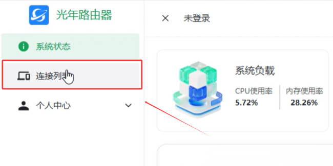 进入光年出海盒子CPE后台,点击左侧“连接列表”,进入设备线路绑定分配页面;